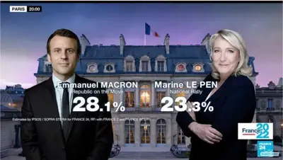Париж вақти билан соат 20:00да Францияда сайлов участкалари ёпилганидан сўнг дарҳол эълон қилинган Ipsos агентлиги социологик сўрови маълумотларига кўра, Э.Макрон 28,1 фоиз, М.Ле Пен эса 23,3 фоиз овоз тўплаган.
